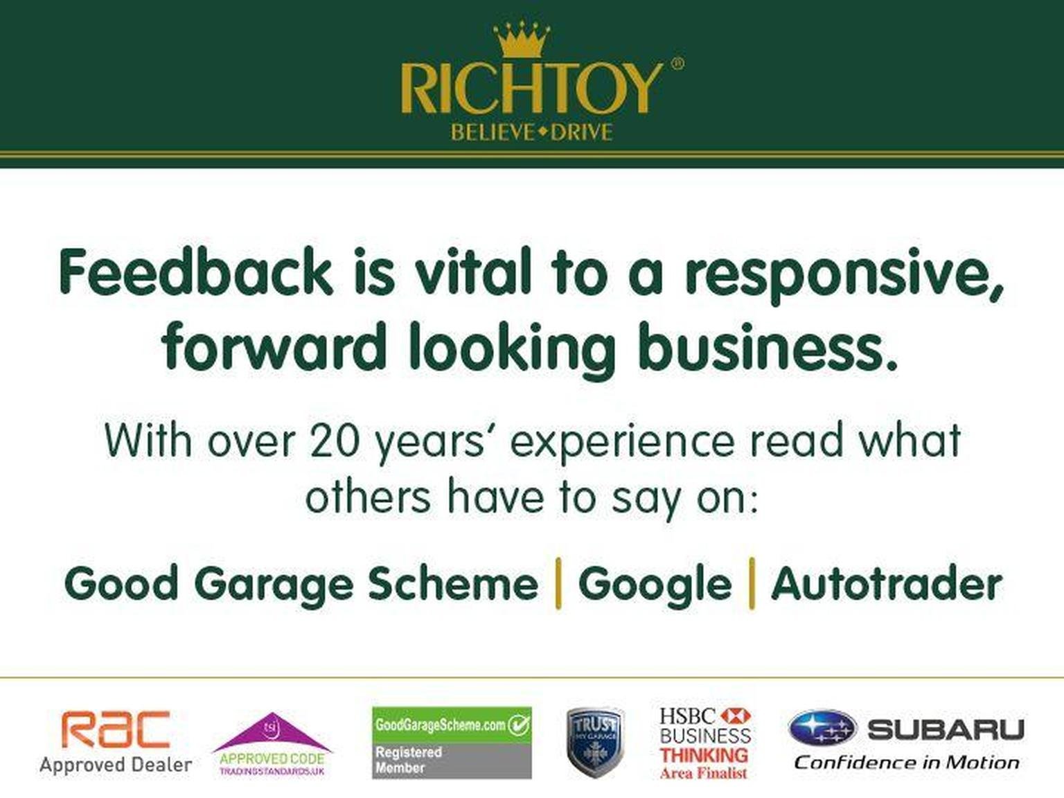 Richtoy has been selling cars for over 20 years working to exceptionally high standards. We review our car prices daily to ensure our customers are always getting the best value when purchasing from Richtoy. All part exchanges are welcome. All our cars are fully service checked by our Main Dealer Trained Technicians, and will have 12 months MOT. In addition, a Data Check (HPI) as standard. All cars come with a minimum of 3 months Warranty. We offer great finance packages and should you wish to discuss after hours, please call Richard on 07768 061748.