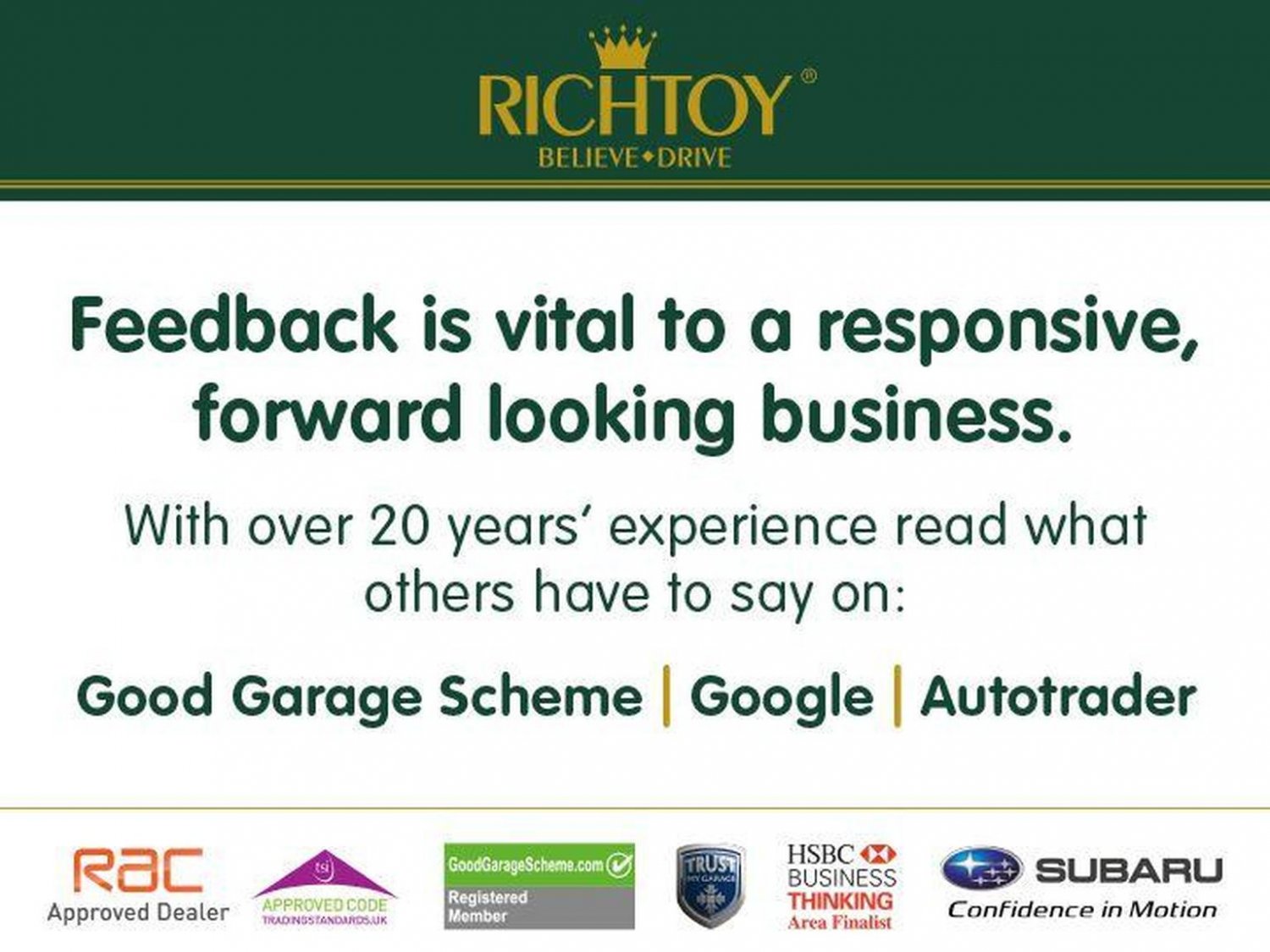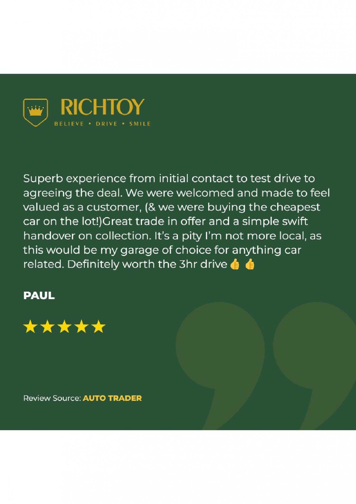 Richtoy has been selling cars for over 20 years working to exceptionally high standards. We review our car prices daily to ensure our customers are always getting the best value when purchasing from Richtoy. All part exchanges are welcome. All our cars are fully service checked by our Main Dealer Trained Technicians, and will have 12 months MOT. In addition, a Data Check (HPI) as standard. All cars come with a minimum of 3 months Warranty. We offer great finance packages and should you wish to discuss after hours, please call Richard on 07768 061748. (Viewing By Appointment Only)